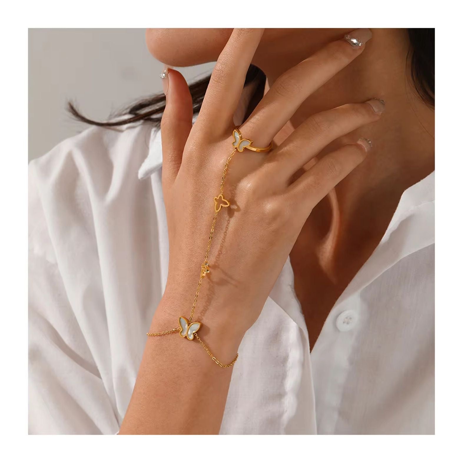 Embrace a touch of enchantment with our Butterfly Hand Harness. This all-in-one jewelry piece features a dainty adjustable ring connected to a matching bracelet by a flowing chain adorned with miniature butterfly charms. Designed to drape elegantly across the back of your hand, it adds a unique, bohemian-inspired sparkle to any outfit.