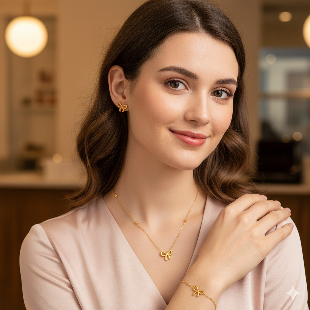 Complete your look with our charming Golden Ribbon Bow Set. This coordinated trio features a dainty necklace, a matching bracelet, and sweet stud earrings, all designed with a polished ribbon motif and tiny gold beads. It’s the perfect way to add a soft, feminine "coquette" touch to your outfit without any effort.
